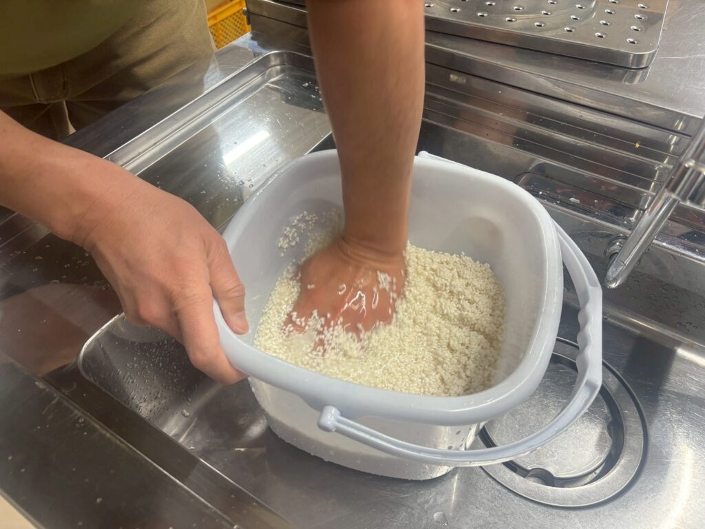 前日から研いで水に浸しておいたもち米を蒸し器で蒸し、いよいよ餅つきスタート!