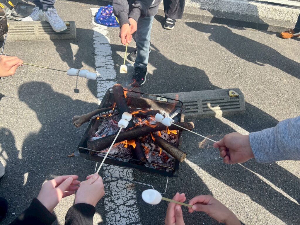 また、餅つきの順番を待つ間も子どもたちが退屈しないように、遊びコーナーや焚き火でのマシュマロ焼きも用意。