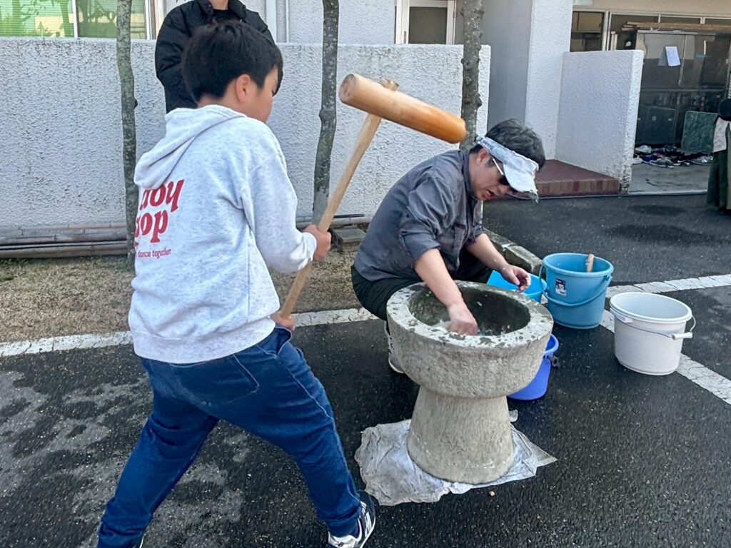 父会メンバーに教えてもらいながら、子どもたちも餅つきにチャレンジ。