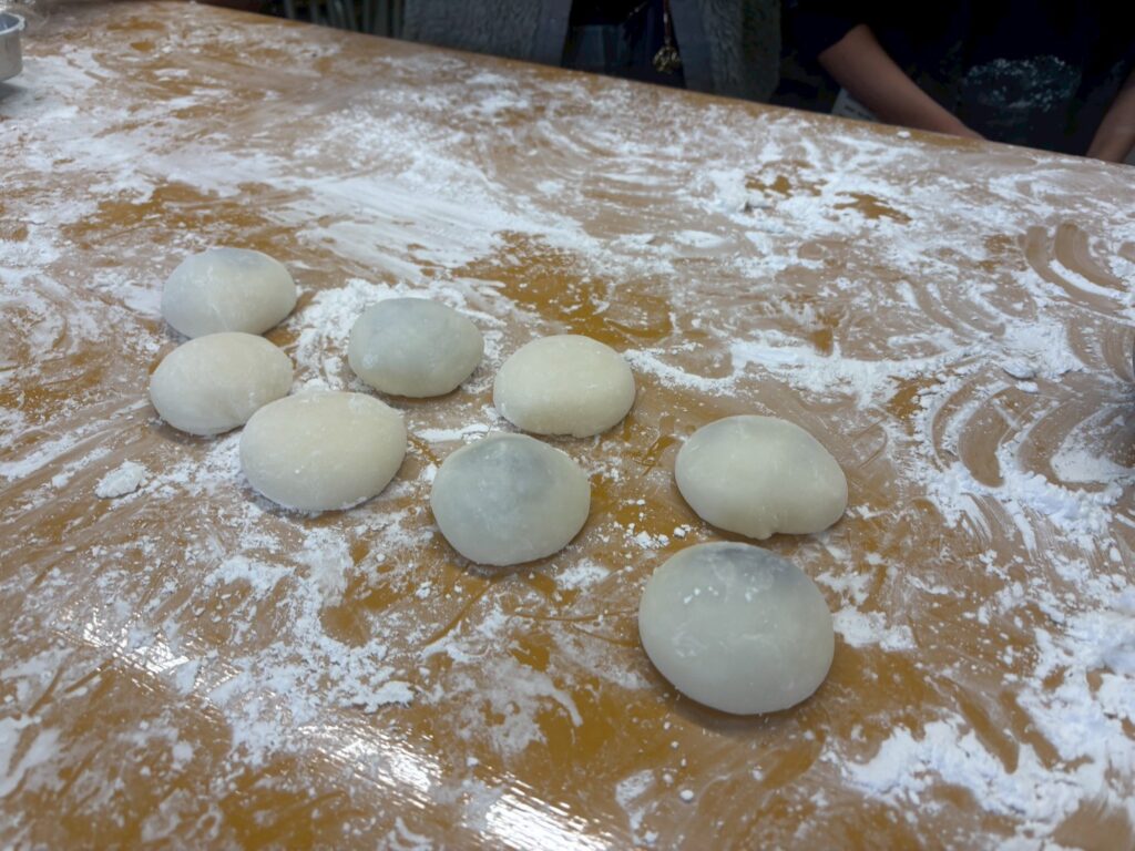 つき上がったお餅は、温かいうちに丸めていきます。