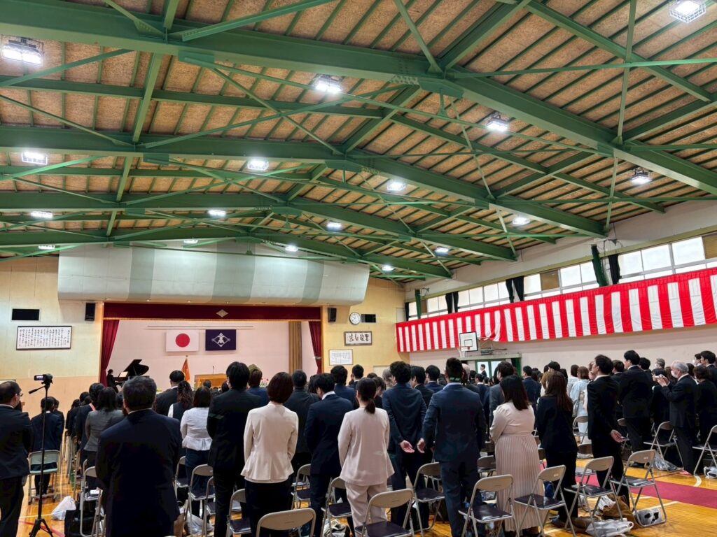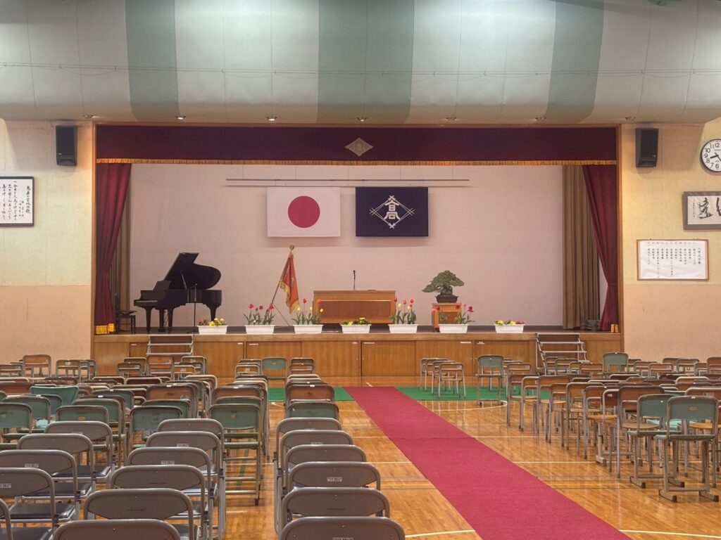 国旗と校旗が静かに掲げられ、少し張りつめた空気の中で入学式が始まりました